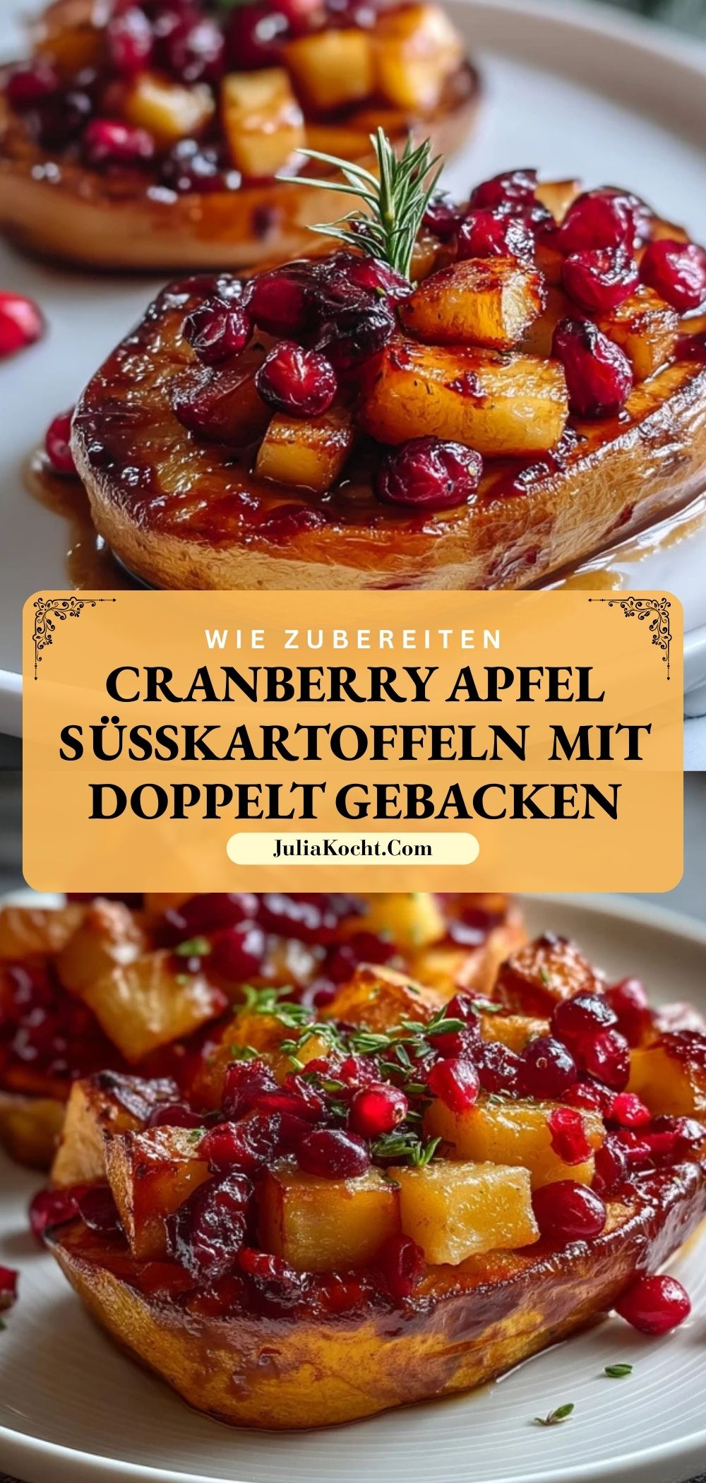 Fruchtig, festlich und einfach unwiderstehlich – Cranberry Apfel Süßkartoffeln mit doppelt gebackenem Finish bringen frischen Schwung auf deinen Tisch! Das Zusammenspiel aus cremiger Süßkartoffel, saftigen Äpfeln und herben Cranberries sorgt für eine harmonische Balance aus süßen, säuerlichen und herzhaften Aromen. Besonders beliebt ist dieses Rezept zu Feiertagen wie Weihnachten oder Thanksgiving, aber auch als vegetarisches Highlight beim Sonntagsessen.