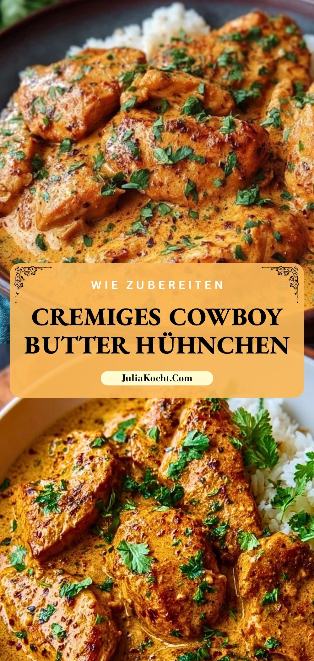 Dieses cremige Cowboy Butter Hühnchen vereint zart gebratene Hähnchenbrust mit einer pikanten, buttrigen Sauce aus Knoblauch, Kräutern, Zitrone und Sahne. Ein Wohlfühlgericht mit dem gewissen Wildwest-Kick – perfekt für schnelle Alltagsküche oder als Highlight für Gäste!
