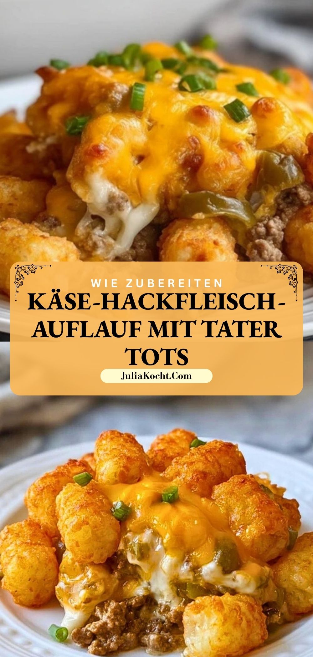Ein Käse-Hackfleisch-Auflauf mit Tater Tots ist das ultimative Wohlfühlessen für kalte Tage oder wenn du einfach etwas Herzhaftes brauchst. Knusprige Tater Tots bilden die goldbraune Kruste, darunter verbirgt sich eine cremige, käsige Schicht aus Hackfleisch, Paprika und einer feinen Sauce. Jeder Bissen vereint würzige Aromen mit einer knusprigen Textur – perfekt für Familienabende, Partys oder als unkompliziertes Abendessen.