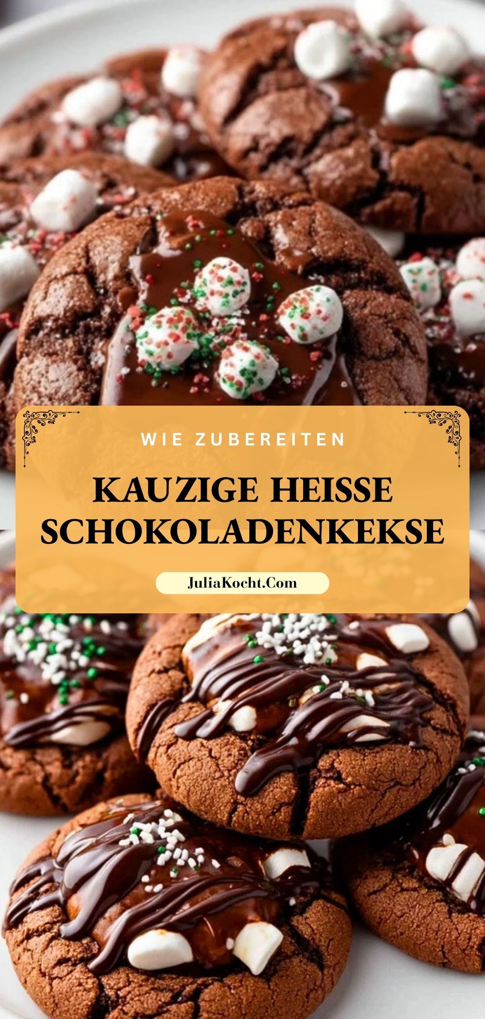 Diese Kekse bringen das wohlig-warme Gefühl einer Tasse heißer Schokolade direkt auf dein Plätzchenteller! Die weiche Schokoladenbasis, getoppt mit einer schmelzenden Marshmallow-Mitte, überzogen mit einer seidigen Schokoglasur und bunten Streuseln, macht sie zu einem Hingucker auf jeder Winter- oder Weihnachtstafel. Sie sind nicht nur ein Genuss für Schokoladenliebhaber, sondern versprechen auch ein besonderes Geschmackserlebnis für Groß und Klein – ideal für kalte Tage oder als festlicher Keks für deine nächste Keksdose.