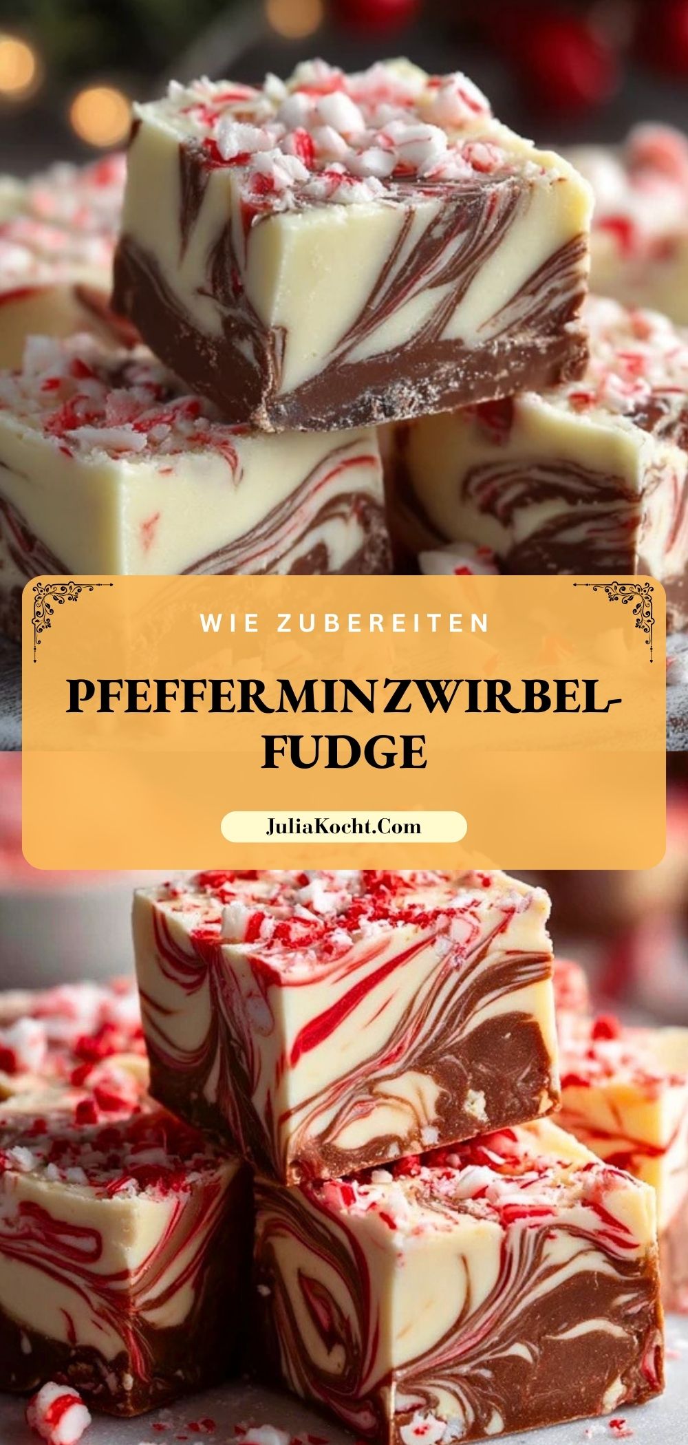Ob zur Weihnachtszeit, als kreatives Geschenk oder einfach nur als süße Verführung zwischendurch – Pfefferminzwirbel-Fudge ist ein echter Hingucker auf jedem Plätzchenteller! Mit seiner cremigen Konsistenz, der marmorierten Optik aus dunkler und weißer Schokolade und dem knusprigen Topping aus zerstoßenen Pfefferminzbonbons bringt er Abwechslung in jede Naschpause. Dieses Rezept ist nicht nur unkompliziert, sondern sorgt mit dem erfrischenden Minzaroma für einen besonderen Genussmoment.