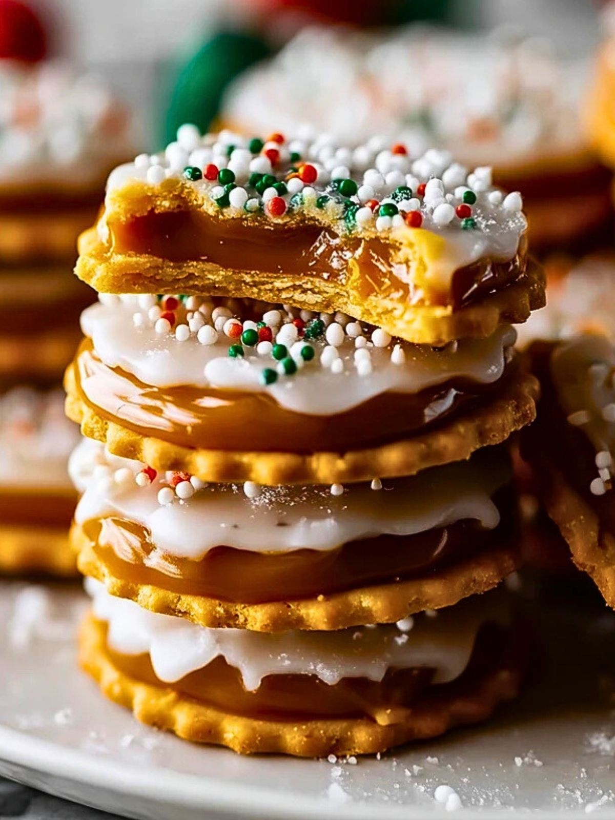Knusprige, leicht salzige Ritz Cracker gefüllt mit cremigem Karamell, überzogen mit weißer Schokolade und dekoriert mit bunten Streuseln – diese Karamell-Ritz-Kekse sind das perfekte Weihnachtsgebäck für die ganze Familie! Schnell zubereitet und einfach unwiderstehlich.
