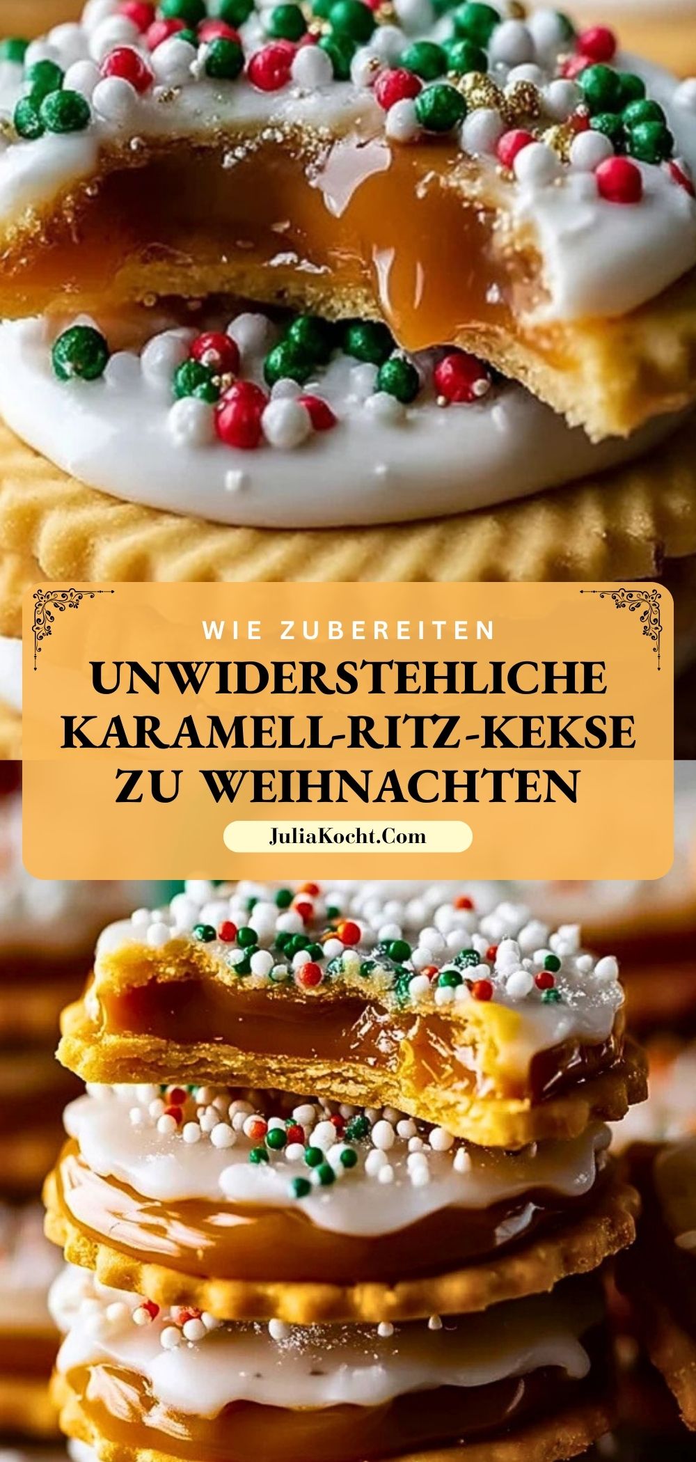 Knusprig, cremig und unwiderstehlich süß – diese Karamell-Ritz-Kekse sind das ultimative Highlight auf jedem Plätzchenteller! Zwei knackige Cracker, gefüllt mit weichem Karamell, umhüllt von weißer Schokolade und getoppt mit festlichen Streuseln: Einfach und schnell gemacht, aber garantiert ein Hingucker für jede Adventszeit. Perfekt für alle, die wenig Zeit haben, aber beim Naschen nicht auf das gewisse Etwas verzichten wollen.